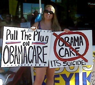 An unidentified hottie in front of the KFYI radio booth displays her opposition to ObamaCare, as well as her nice legs. In Barbara's last message, she reported that it's 100 degrees in Phoenix today, so if the Tea Party ladies are dressed for the weather . . . We're understanding. We care.